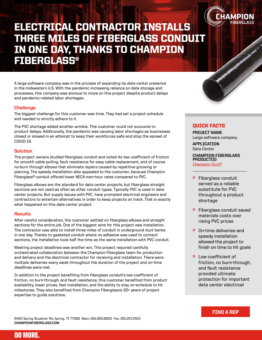 You’ve trusted Champion Fiberglass® with the most critical aspects of data center construction — no burn-through elbows. Now you can trust fiberglass conduit straights, as this contractor did, as a solution to the rising prices and product delays of PVC conduit.